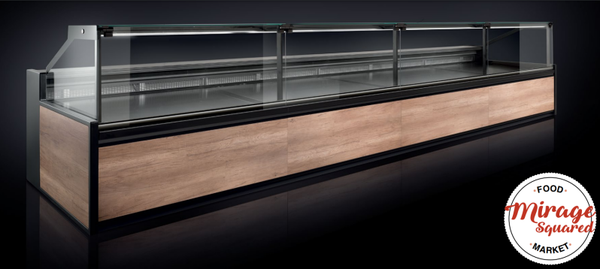 Mirage Squared standard dispose de présentoirs amovibles en acier inoxydable AISI 304 et d'un système de réfrigération ventilé par soupape avec régulation de la vitesse de l'air. Même les porte-papier en acier inoxydable sont standard, tout comme les prises Schuko 220V. Les vitres s'ouvrent vers le haut grâce à des pistons hydro-lift et disposent d'un désembuage pneumatique. Sur demande (en option), il est possible de monter la fermeture arrière avec volet roulant ou portes coulissantes en plexiglas.