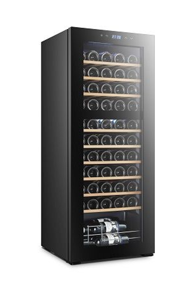 510x480x1262, 220V, 0,08 kW, 43,5 kg, 55 bouteilles, compresseur, plage de température 5-18T-C, 3+6 étagères, thermostat réglable, porte vitrée, deux températures. zones, château, étagères en bois