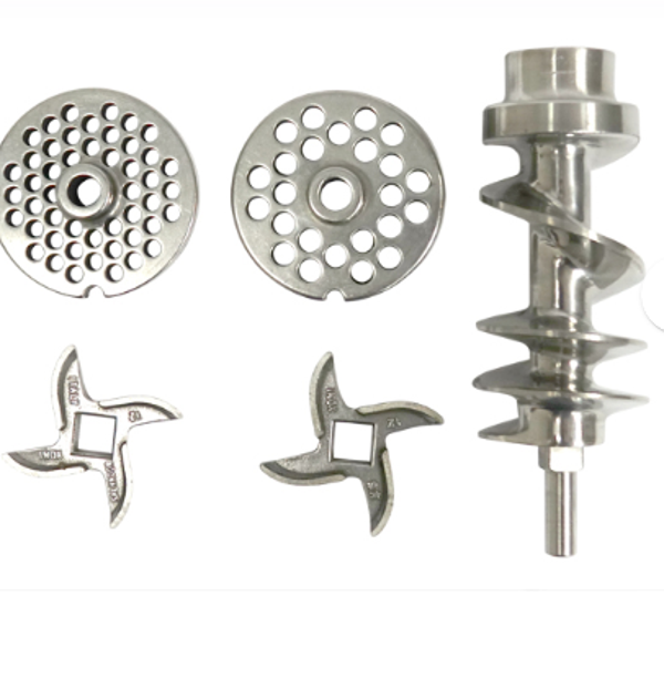 Le kit comprend un plateau d'alimentation, un poussoir, 2 couteaux et 2 plaques de broyage (6 et 8 mm).