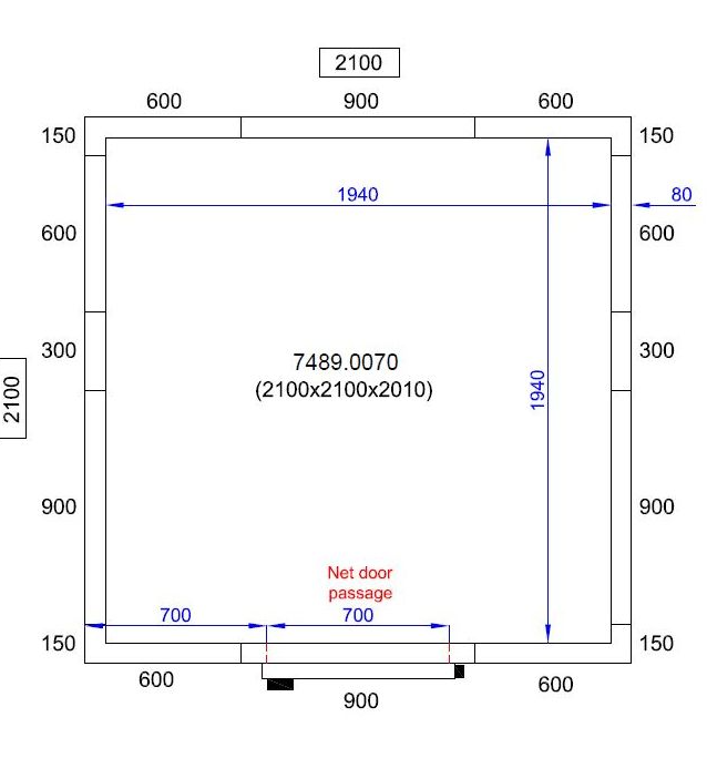 Chambre froide dimension 2100x2100x2010 , volume 6.9m3, porte 700x1845, sol inox